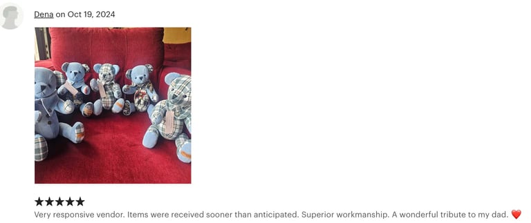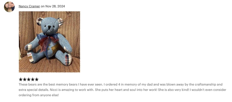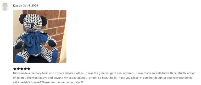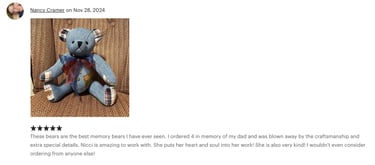 At Niccinoo Creations, we transform cherished items into unique memory bears and keepsakes, handcrafting each piece to preserve your most treasured moments in a one-of-a-kind treasure.